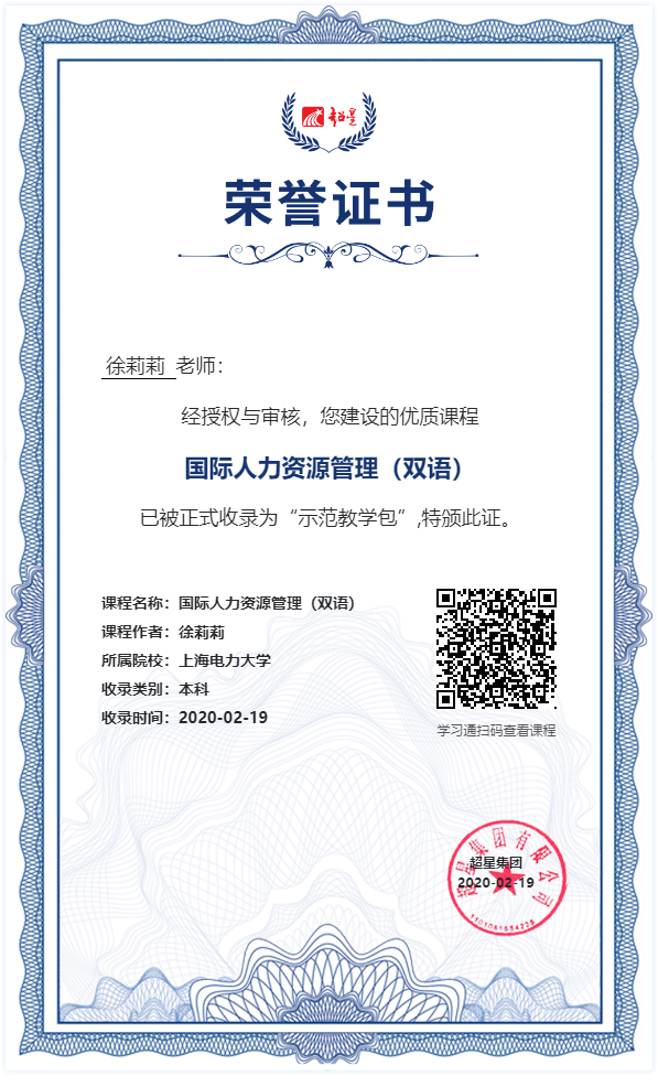 图3徐老师的《国际人力资源管理》课程签约超星学银在线教学示范包