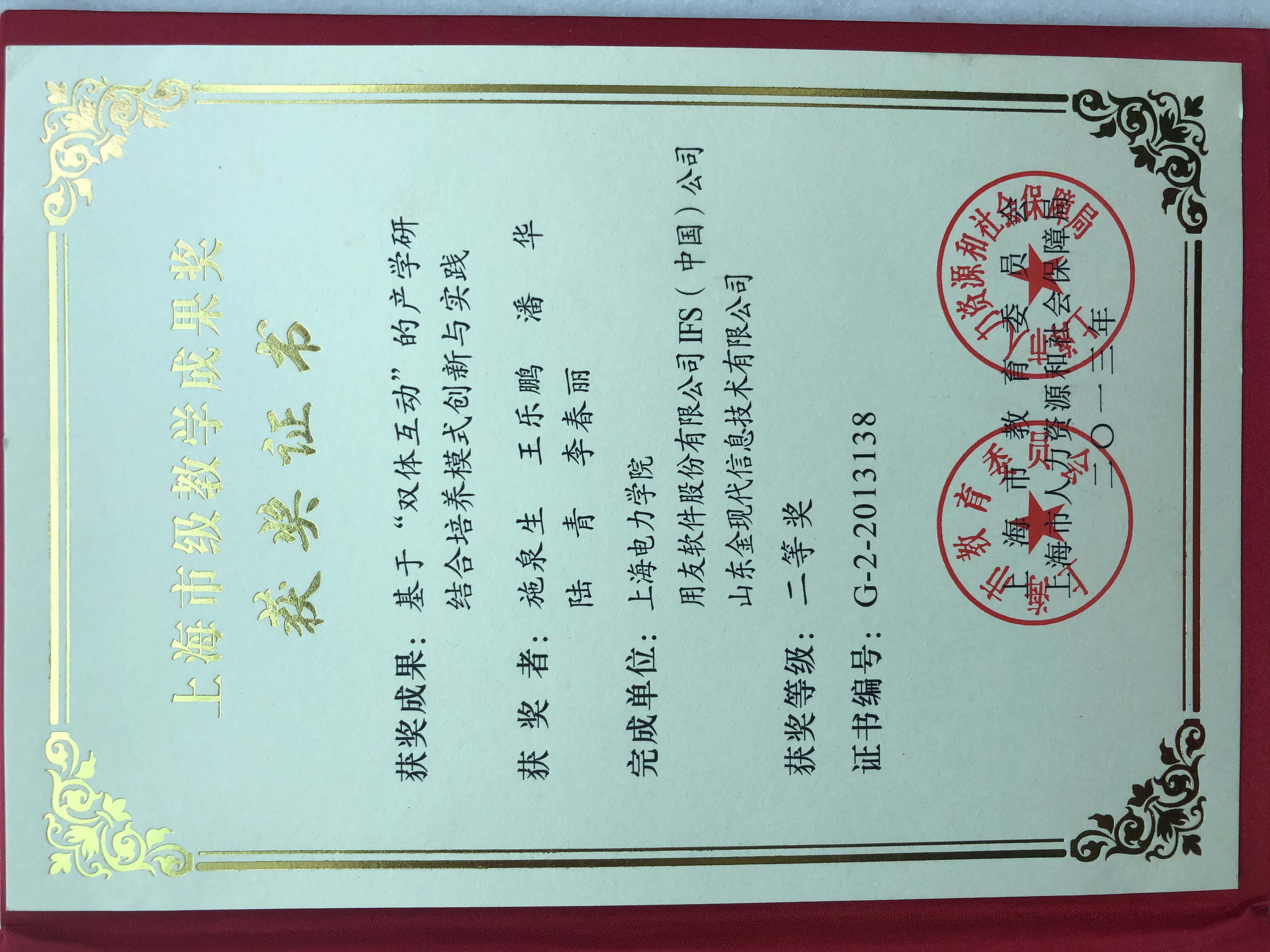 图8李老师团队获奖证书-上海市教学成果二等奖