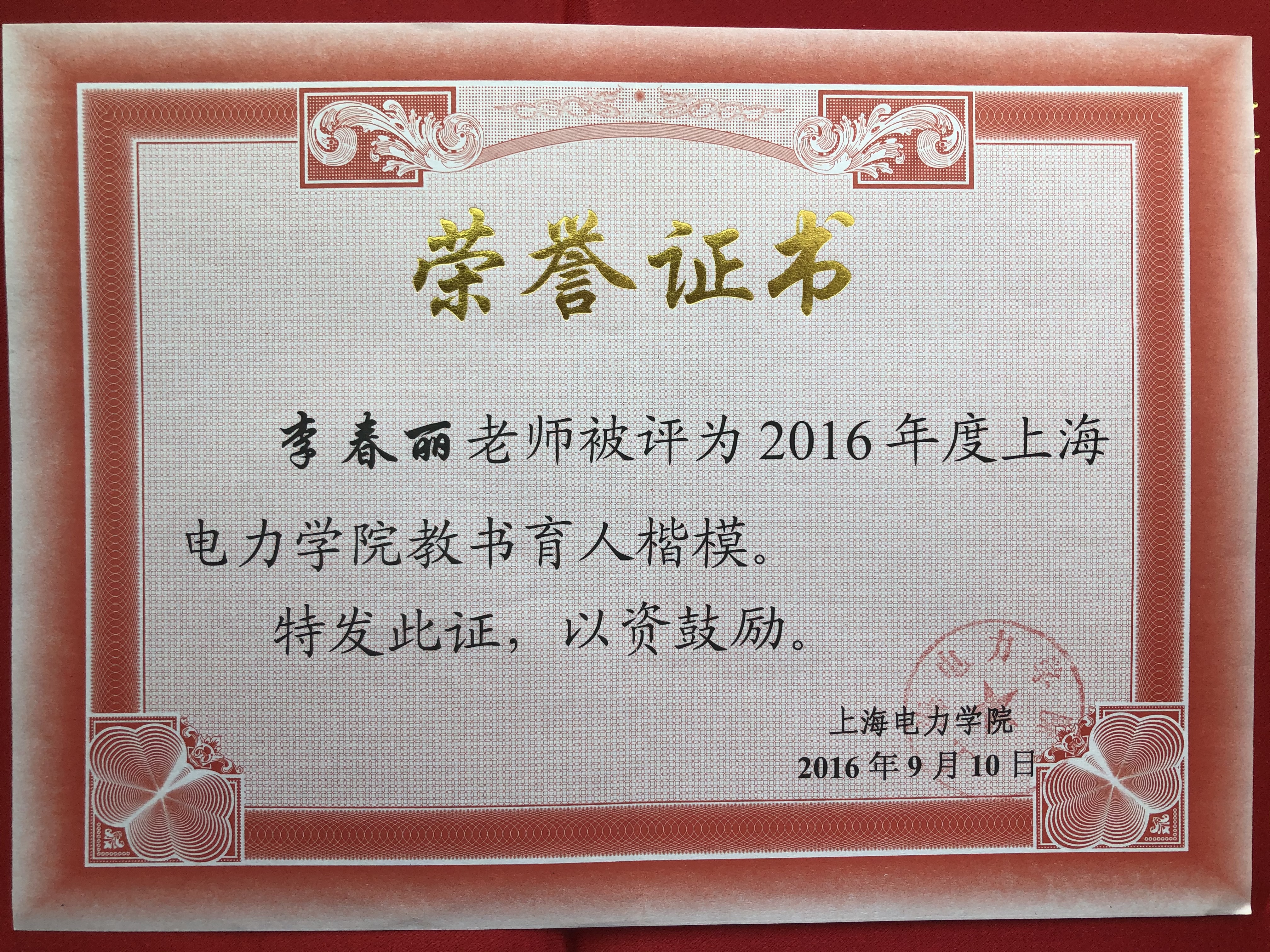 图5 李老师荣获永利集团88304官网教书育人楷模