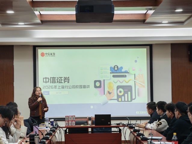 交流会后,中信证券上海分公司面向全校同学举办了2026年校园招聘专场宣讲会。校总会计师张川、经管学院党委书记潘华、党委副书记孟延新、副院长胡伟莅临现场交流。张川总会计师在开场致辞中对企业首次来校开展专场招聘表示热烈欢迎,并强调了校企合作对促进人才培养和学生高质量就业的重要意义,鼓励到场学子积极主动进取,探索了解金融行业,谋划未来职业发展。陈哲就公司发展前景、招聘需求及晋升通道等学生关切的内容进行了宣讲介绍。在互动环节,同学们踊跃提问,企业代表耐心解答,现场气氛热烈,为学生们提供了宝贵的行业认知和职业规划指导。