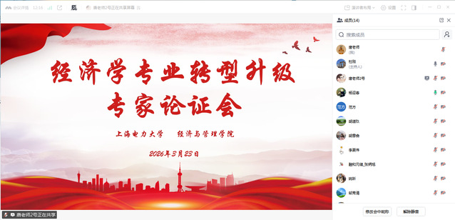3月23日下午,经管学院组织召开了经济学专业转型专家论证会。会议特邀中国石油大学(北京)经济管理学院副院长赵晓丽、厦门大学经济学院中国能源经济研究中心姚昕教授、华北电力大学张兴平教授、上海融和元储能源有限公司招聘经理张炳旭和上海华电集科分布式能源有限公司执行董事、总经理范方五位专家进行线上论证。经管学院院长杜刚、院务秘书杨迎春、应用经济系主任胡道玖和经济学专业骨干教师参加会议。会议由杜刚主持。