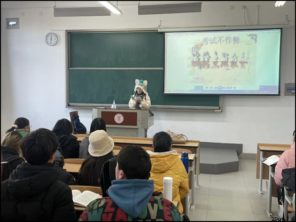班会上鼓动班级中学习成绩优异与学习成绩后进的学生“结对子,进行“一对一”帮扶,形式不局限于共同自习、分享学习笔记与重点辅导答疑等,教导学生考前扎实复习每一门课程,提醒同学们考场上沉着冷静、认真答卷,拒绝作弊。